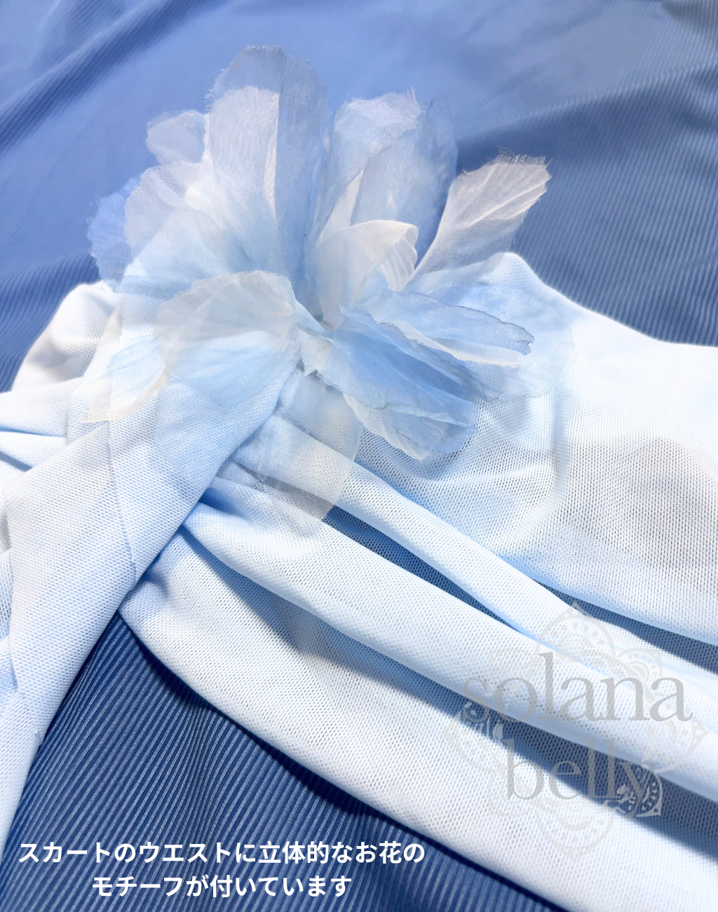 立体的なお花のモチーフがトップスとスカートに装飾された、華やかな新作レッスン着。
