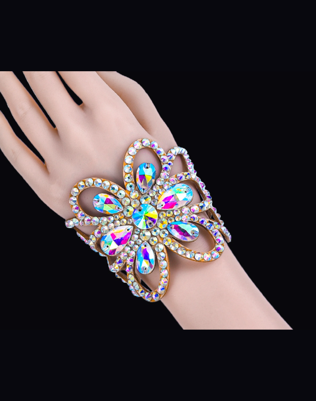 身に着けるだけで衣装・レッスンウェアがワンランク格上げされて垢抜ける軽量ハンドアクセサリー。手首に大粒のビジューが輝く洗練されたデザイン。」