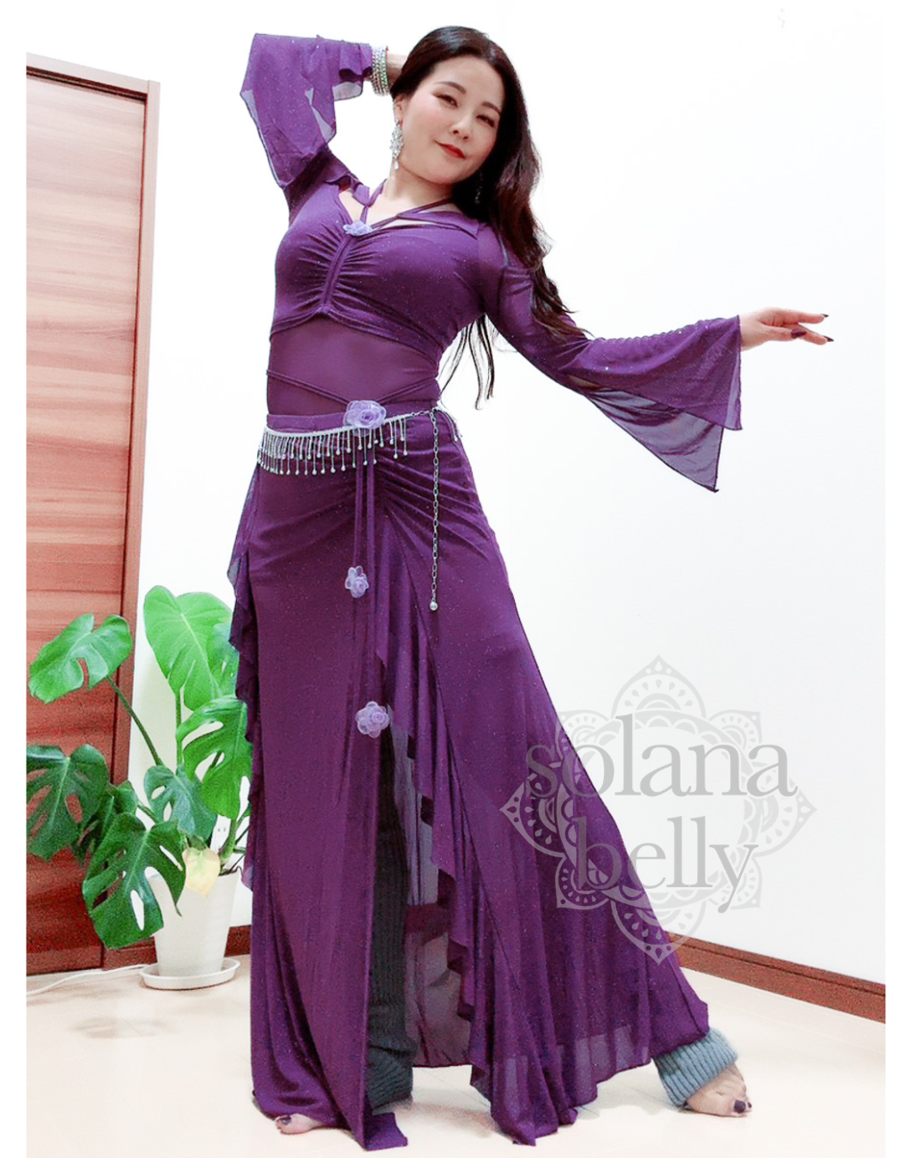 露出を控えめにしながらも、ベリーダンスらしい女性らしさとエレガントさを感じられる一着。ベリーダンス仲間や先生から「素敵!」と褒められるアイテムです。