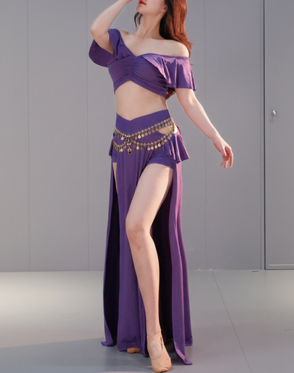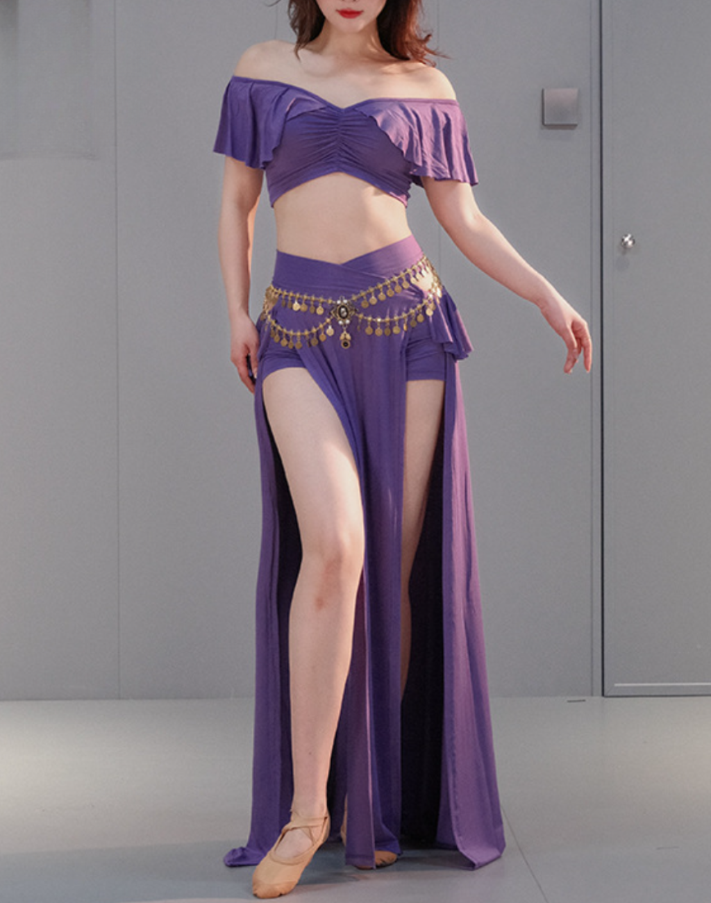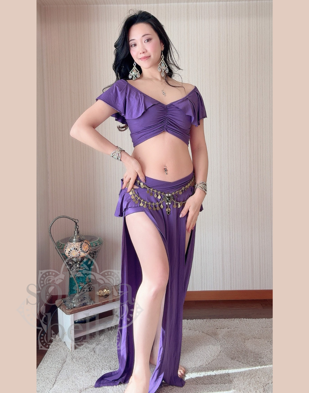 ハイウエスト×オフショルダーが魅力の、大人の女性にぴったりなベリーダンス レッスン着。